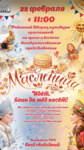 Дорогие друзья! Зима ещё держит район в лёгком морозном объятии, но уже чувствуется — где-то рядом крадётся весна. И самый веселый, самый вкусный и шумный праздник, который прогоняет стужу и зовёт солнце, уже на пороге! Районный Дворец культуры приглашает детей и взрослых на грандиозное театрализованное представление «Масленица».