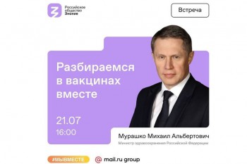 В среду, 21 июля, в 16:00, в рамках просветительской кампании Российского общества «Знание» «Разберемся в вакцинах вместе», посвященной вопросам вакцинации от новой коронавирусной инфекции COVID-19, состоится прямой эфир с министром здравоохранения Российской Федерации Михаилом Мурашко.